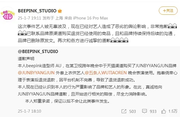 1月7日下午,为五条人提供外套上衣的造型师发文致歉,称其在某卫视跨年晚会中购买了该品牌外套上衣供艺人五条人晚会表演使用,抱着侥幸心理于表演后退货退款,因平台机制不完善,导致了退货退款成功。其表示已经开始进行相关赔偿。